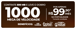 Consulte condições - São partes deste regulamento a pessoa que fechar o plano Onitel doravante denominada “CLIENTE”, qualificado no Termo de Adesão do Provedor, e doravante denominada simplesmente “PRESTADORA” ou “ONITEL”. 1.DESCRIÇÃO GERAL DA PROMOÇÃO 1.1. A Promoção “Ano novo Plano novo’’ tem por objetivo incentivar a adesão aos planos de serviços Onitel. A Promoção consiste em contratar o plano de 500mega por R$ 99,90 por 12 meses pagando na pontualidade, 800mega por R$55,90* por 3 meses e R$ 125,90 por 9 meses (VÁLIDOS PARA PLANOS PESSOA FÍSICA), pagando na pontualidade 1GIGA por R$149,90 por 12 meses pagando na pontualidade (VÁLIDOS PARA PLANOS PESSOA FÍSICA), todos os planos possuem permanência de 12 meses. 2. Para participar da promoção, é necessário ser aprovado na análise interna da Onitel. 3.CLIENTES ELEGÍVEIS À ADESÃO; 3.1.São elegíveis pessoas físicas, que possuírem acesso à internet dentro da área de prestação da Prestadora; 3.2.Análise interna, para isenção de taxa de Instalação,devendo consultar condições; 4.PERÍODO DE VIGÊNCIA DA PROMOÇÃO; 4.1.A promoção inicia em 01/12/2023 e termina em 31/01/2024, podendo ser alterada ou descontinuada a exclusivo critério da Onitel. 5.COMO FUNCIONA A PROMOÇÃO; 5.1.Toda e qualquer pessoa que faça o fechamento do plano via nossos canais de atendimento, sendo eles: Fechamento via presencial; Fechamento pelas redes sociais: Instagram e facebook; Fechamento via ligação; Fechamento pela promoção do indique e ganhe. Fechamento com nossos vendedores externos (Porta a Porta). 6.SOBRE A PROMOÇÃO; 6.1.O cliente pagará o VALOR DO PLANO CONTRATADO, válido para todos os planos listados neste panfleto; Pessoa física; 7.DISPOSIÇÕES FINAIS; 7.1. Para mais informações, entre em contato com nosso SAC,através do 0800 780 2288 de qualquer telefone, ou acesse o site https://www.onitel.com.br/.